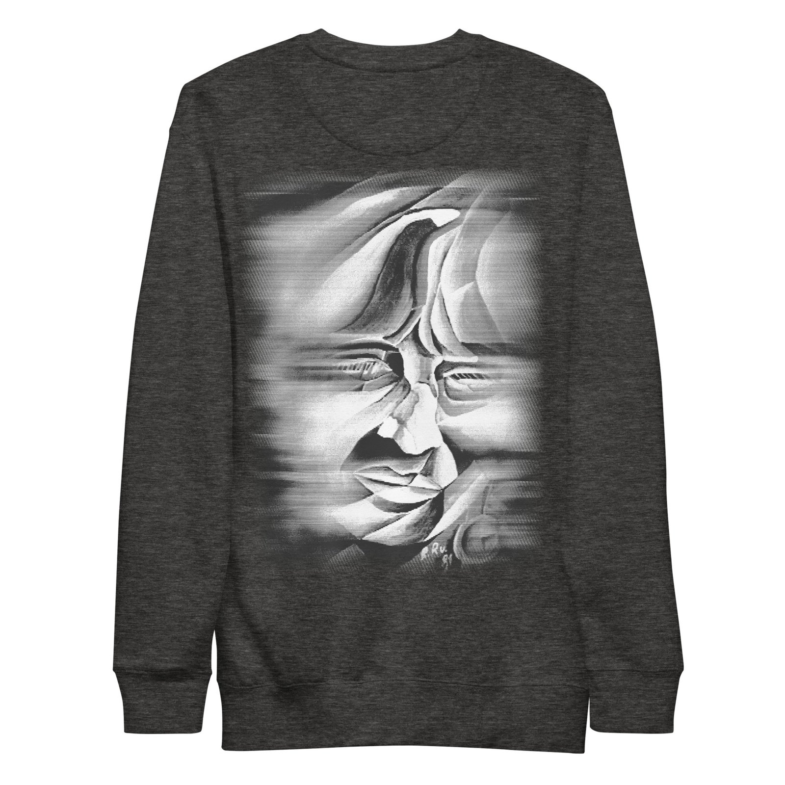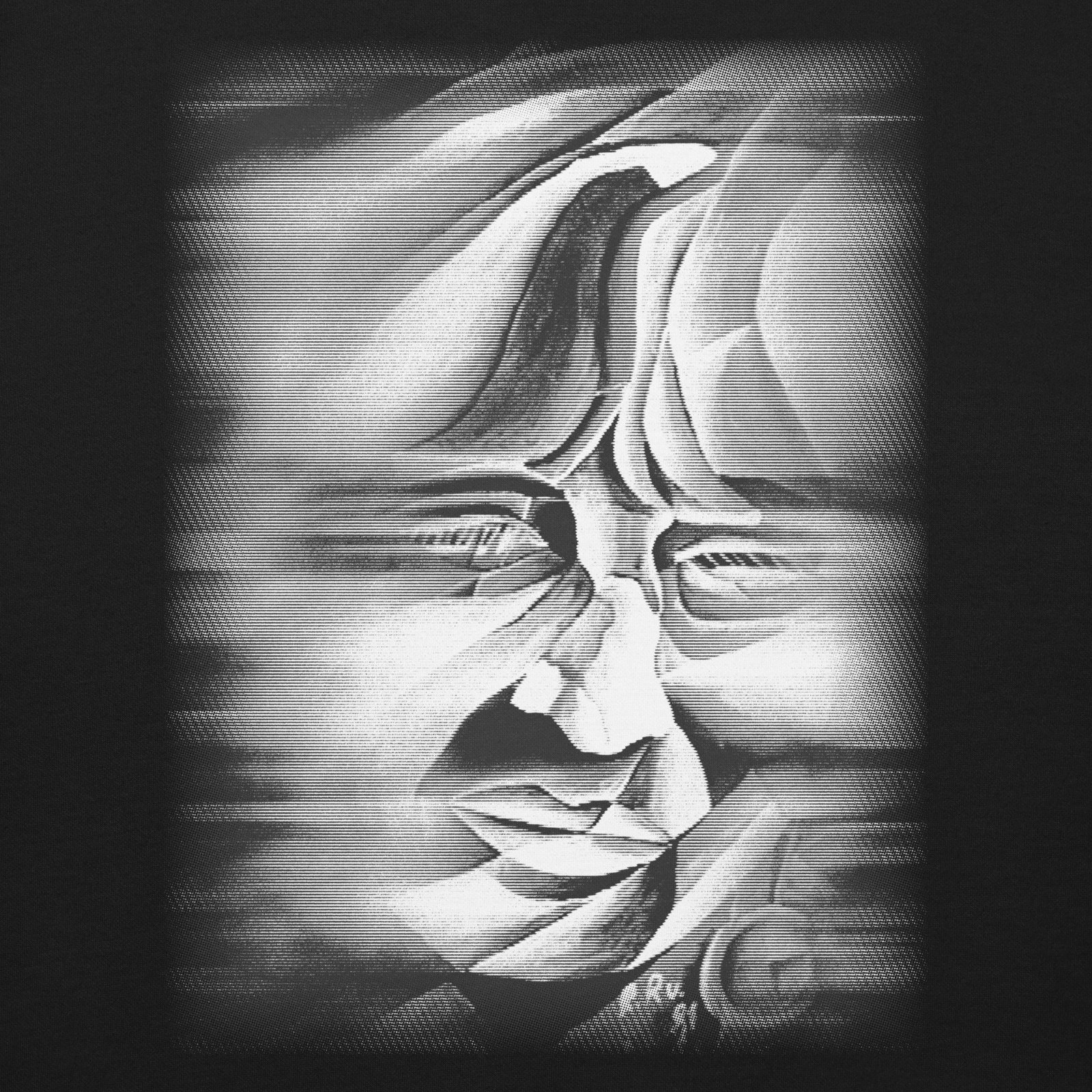 abstract glitch art hoodie – black & white distorted face backprint | unisex cyberwearAbstract Glitch Art Hoodie – Black & White Distorted Face Backprint | Unisex Cyberwear